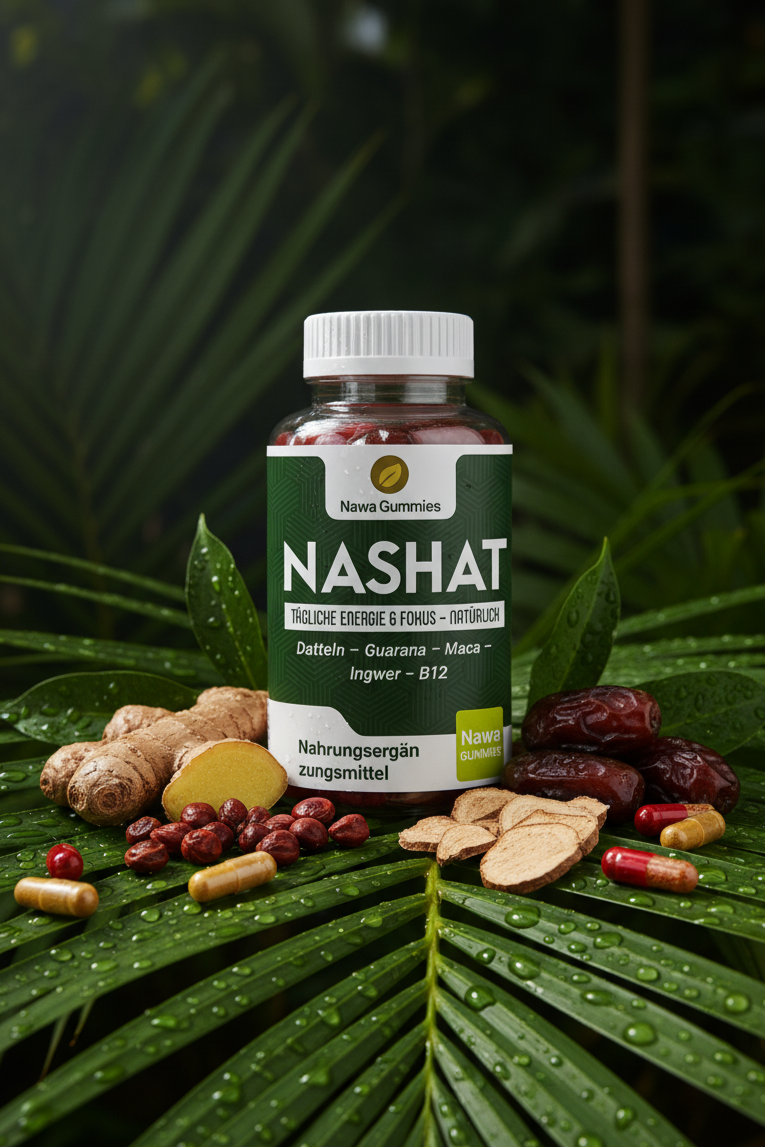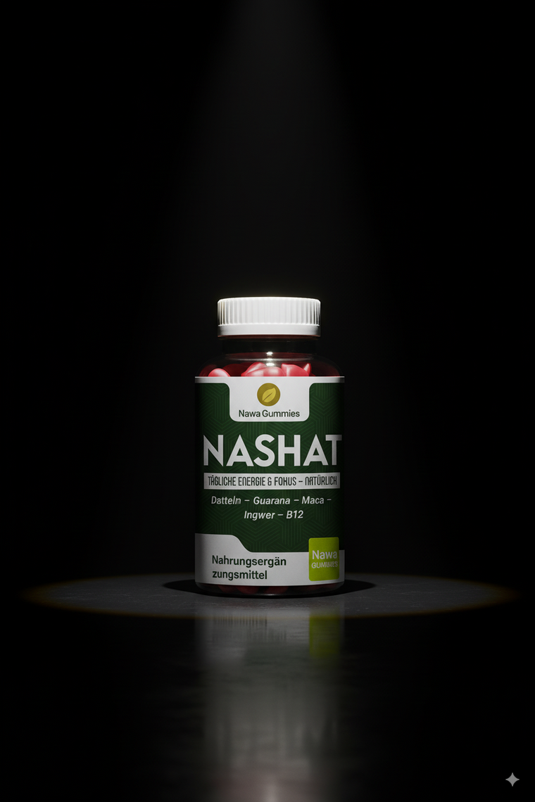 Nawa Nashat ist mehr als ein Supplement. Unsere halal- und veganen Gummies kombinieren Dattel, Maca, Ingwer, Guarana und Vitamin B12 zu einer sanften, ausgewogenen Formel, die dir täglich Energie und Fokus schenkt – ganz ohne Zucker und ohne künstliche Zusätze.